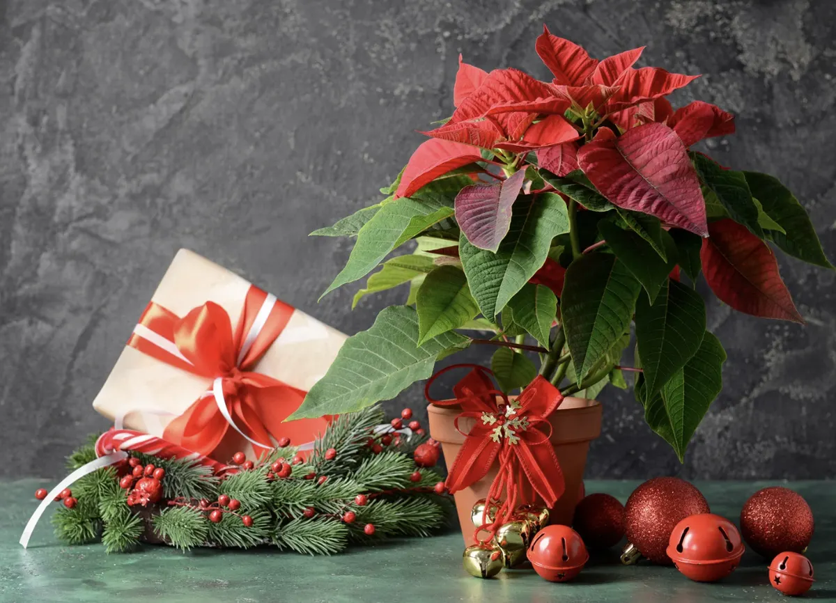 🎅 1. 冬の代表「ポインセチア」「ヒイラギ」「針葉樹」を取り入れる