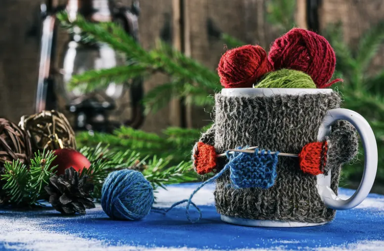 観葉植物の鉢を、ニット素材や木製の鉢カバーに変えてみるだけで、ぐっと冬の雰囲気に。