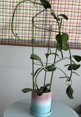 初めて咲きました🌸 ホヤカーリースプラッシュ💚南向きのリビングの日当たりの良い場所で育てています。レースのカーテン越しです。育て初めて3年くらいで初めて花座がついて咲きました🌸先日、支柱が小さくなったので、この支柱に巻きつけていたら長い蔓をポキッとやってしまって、いま水挿ししてます😅蔓が太いので巻きつけるのがとっても難
