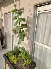 きゅうり🥒のその後… 2週間前に植えたきゅうりの背丈がこんなに大きくなりました☺️🪴 とりあえずYouTubeで見た通り先端はちょきっと✂葉っぱの数も多くないしとりあえず様子見でいいのかな? 家庭菜園、奥が深いです。難しい…!